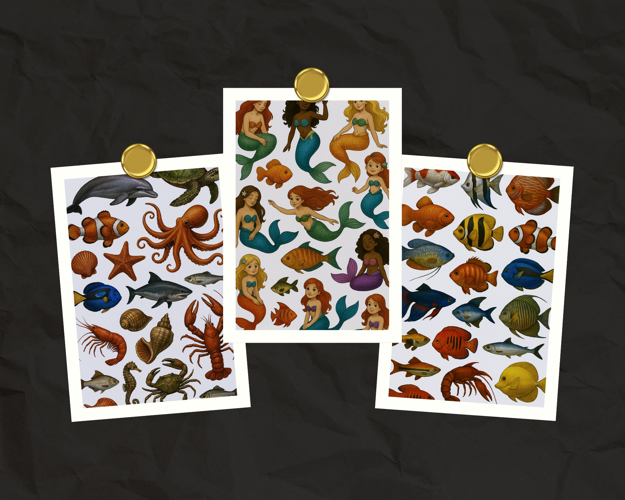 • A variety of sea creatures (octopus, starfish, crab, dolphin, and more)
